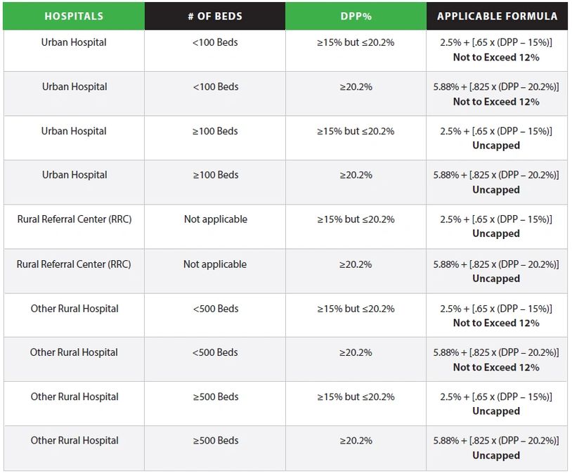 Once the DPP is calculated, a hospital is categorized as a means of determining the DSH Payment qualification, provided that that hospital’s DPP is at least 15%. The following table delineates the classification criteria and the formula for calculating the hospital’s DSH payment based upon its categorization.